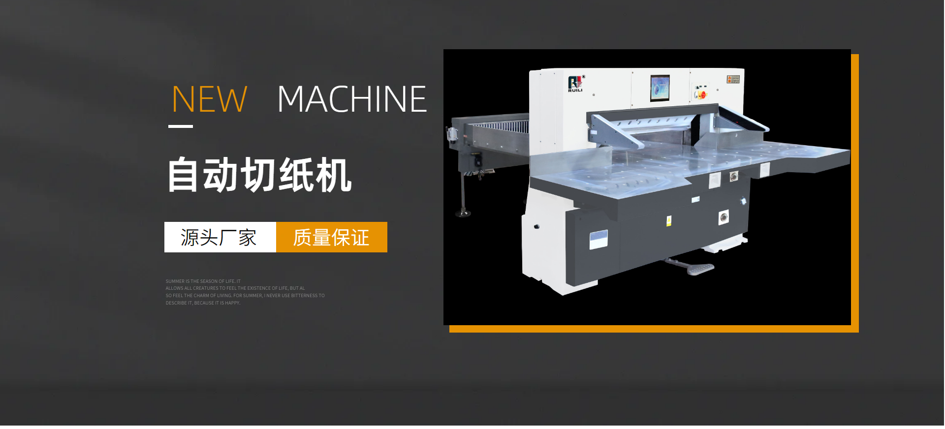 瑞安市瑞勝機(jī)械有限公司是一家專業(yè)集“生產(chǎn)、銷售、服務(wù)”于一體的印刷包裝機(jī)械企業(yè);有二十余年專業(yè)制造切紙機(jī)的經(jīng)驗(yàn),在切紙機(jī)行業(yè)中享有較高聲譽(yù)。研制出集光、機(jī)電、液為一體的高性能高品質(zhì)的切紙機(jī)系列產(chǎn)品,主要產(chǎn)品有電腦切紙機(jī),雙液壓電腦切紙機(jī),雙導(dǎo)軌數(shù)顯切紙機(jī),快捷式壓痕機(jī)系列,覆膜機(jī)、上光機(jī)、燙金機(jī)等系列產(chǎn)品。